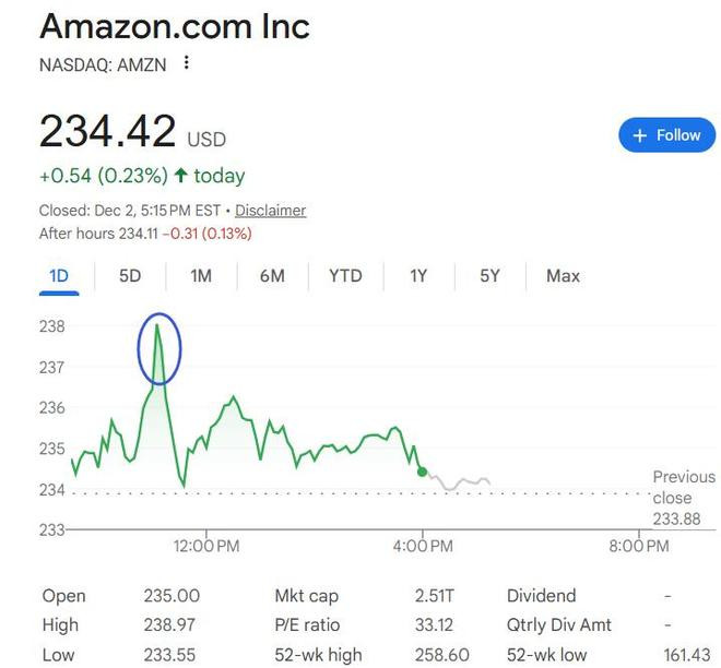 新AI芯片的消息公布后,亚马逊股价逼近239美元刷新日高,日内涨幅扩大到将近2.2%,而盘初曾涨3.2%的英伟达股价进一步收窄涨幅,美股早盘尾声时刷新日低,几乎抹平所有涨幅。其竞争对手AMD的股价跌幅扩大、日内跌近1.7%。到收盘,亚马逊涨逾0.2%,英伟达涨近0.9%,AMD跌近2.1%。
