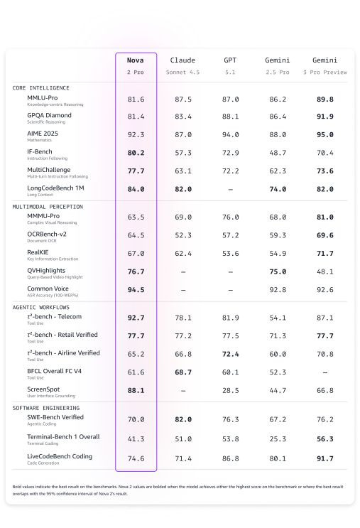 Nova2Pro是亚马逊最智能的推理模型,可处理文本、图像、视频和语音并生成文本,适用于代理编码、长期规划等高度复杂任务。该模型在与ClaudeSonnet4.5的16项基准测试中有10项表现更优或持平,与GPT-5.1的16项测试中有8项更优或持平,与Gemini2.5Pro的19项测试中有15项更优或持平。